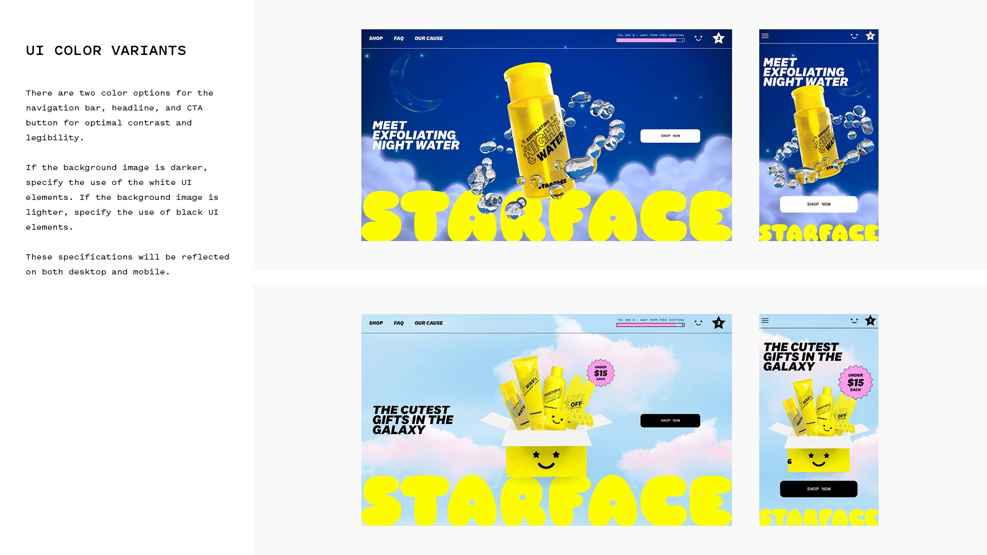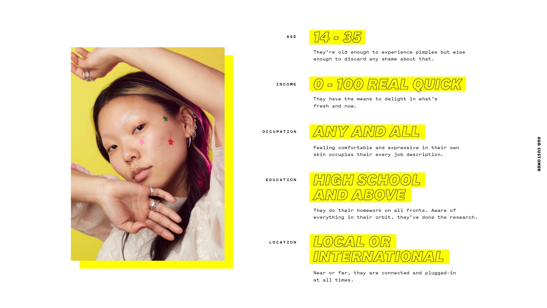We created a playful and off-beat world led by Big Yellow, a cheerful alien character embodying individuality and self-acceptance. In contrast to traditional beauty brands, Big Yellow’s acne positivity journey connected with teens and young adults around the world, encouraging identity exploration with a sweet, uplifting spirit. With each product launch, we introduced new “friends from space” through 3D animations tailored to product names like Moisture on Mars and Night Water.